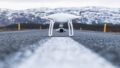 夕暮れの海上を飛ぶ白いドローンと夕焼け空